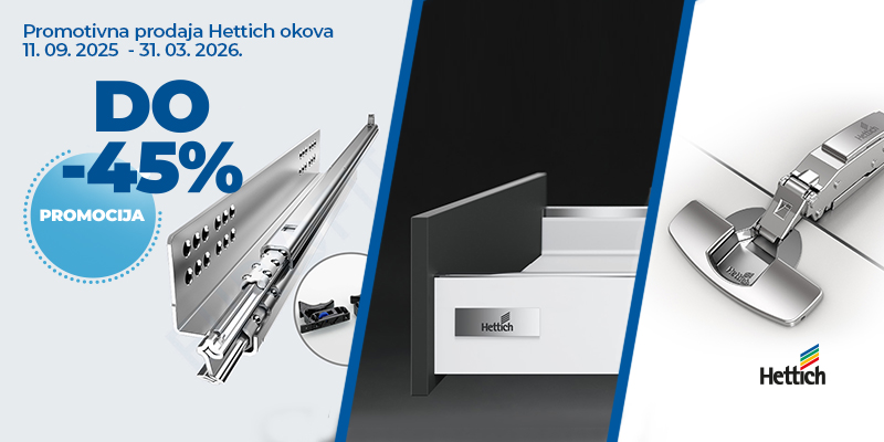 Za promociju nove lager kolekcije HETTICH OKOVA pripremili smo proizvode sa posebnim promo cenama. Promocija se odnosi na određenu definisanu minimalnu količinu po porudžbini i ima ograničeno trajanje od 11.09.2025. do 31.03 .2026. Kompletni listu proizvoda možete pogledati u sekciji „Proizvodi“. Za sve dodatne informacije dostupan vam je vaš regionalni menadžer prodaje.